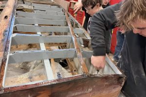 The project really kicked off into high gear once the Central Valley students were back from their winter break. Paul Rodkey—project manager and owner—had plenty of decisions ahead of him. First on the list was flipping the Ventnor on its trailer. They wanted to keep the option open to move the boat in and out of the shop, or even back to Paul’s house if needed. The boat is estimated to weigh around 1,100 pounds, but with enough hands on deck, flipping the 17-footer wasn’t really isn’t a big deal. Under the watchful eye of Central Valley High School’s teacher Ron Beard, the students slid a few 2x6s under the trailer and rolled the boat right over onto it. Job #1—done.