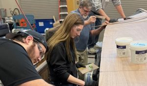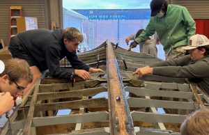 The project really kicked off into high gear once the Central Valley students were back from their winter break. Paul Rodkey—project manager and owner—had plenty of decisions ahead of him. First on the list was flipping the Ventnor on its trailer. They wanted to keep the option open to move the boat in and out of the shop, or even back to Paul’s house if needed. The boat is estimated to weigh around 1,100 pounds, but with enough hands on deck, flipping the 17-footer wasn’t really isn’t a big deal. Under the watchful eye of Central Valley High School’s teacher Ron Beard, the students slid a few 2x6s under the trailer and rolled the boat right over onto it. Job #1—done.