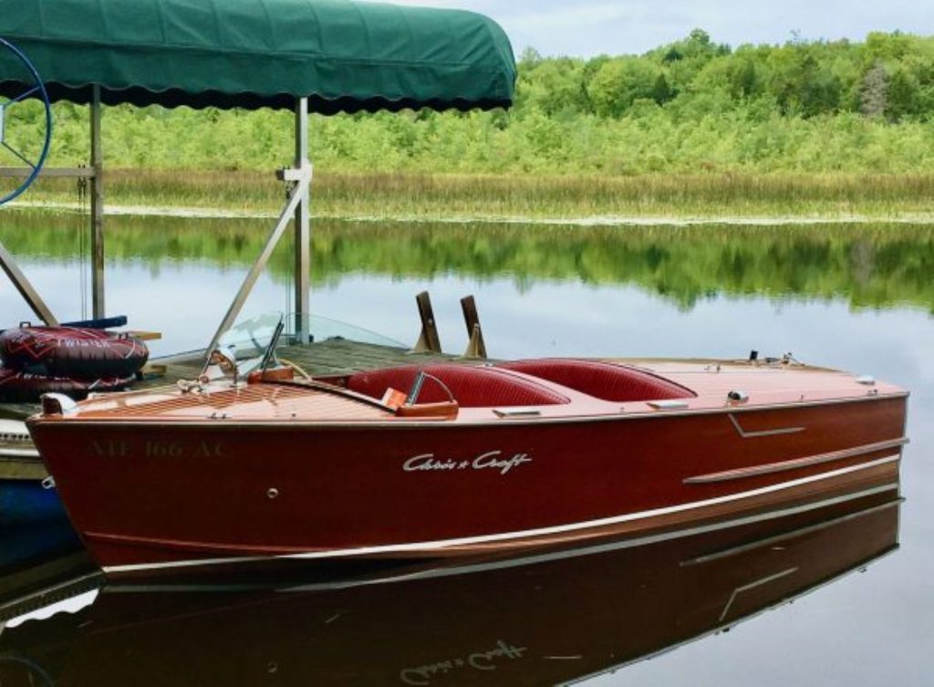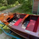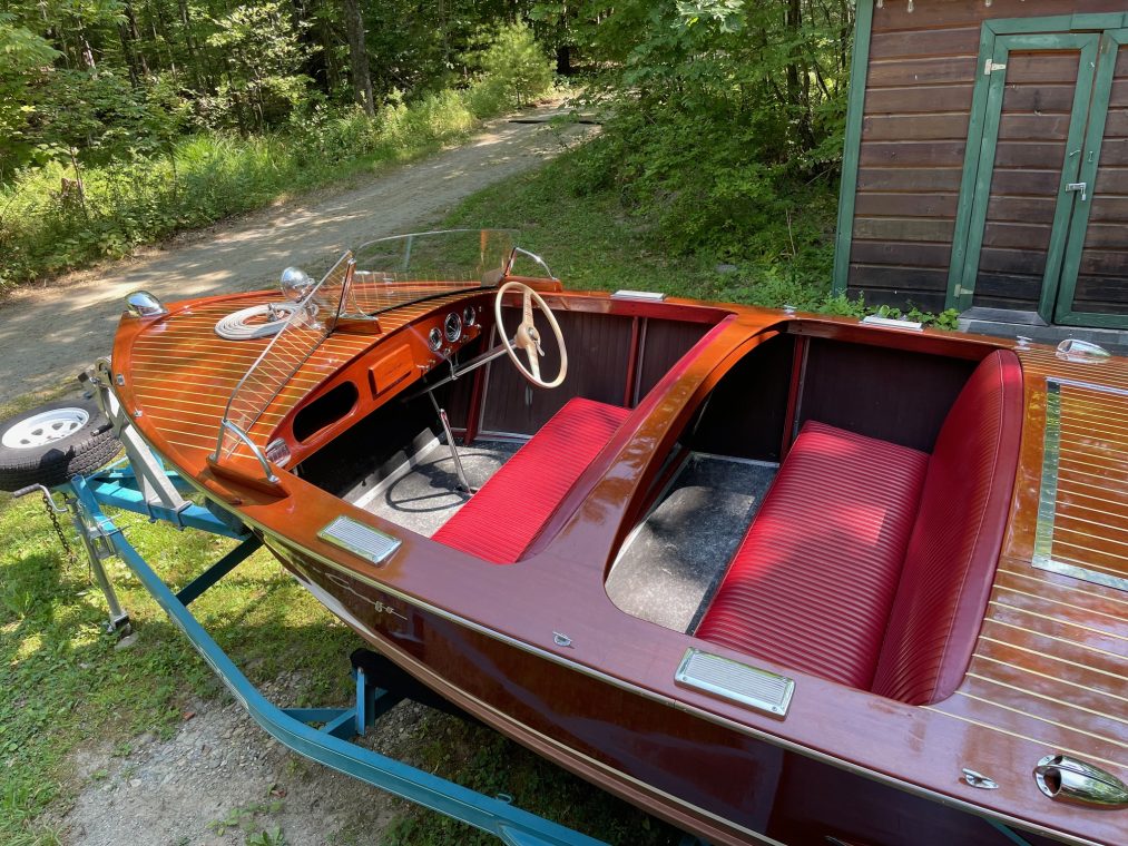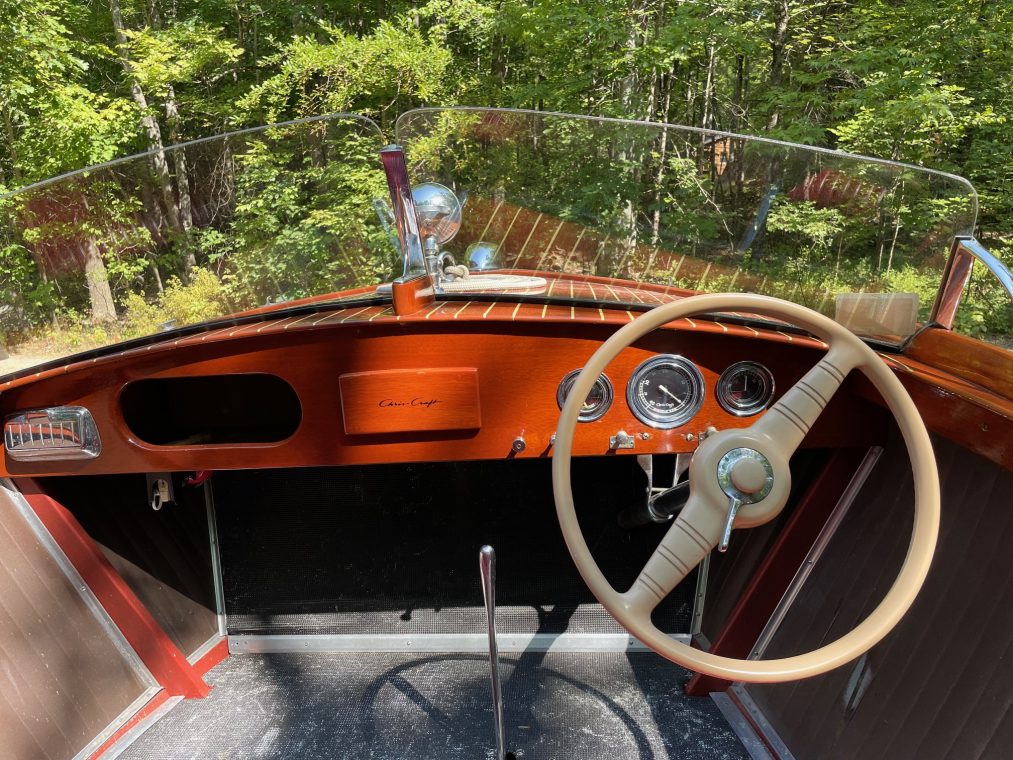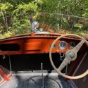Completely restored. The original bottom has been removed and using the original planking, waterproofed and sanded, stained and varnished. Over the past 20 years, completely varnished four times and currently has seven coats of varnish, the most recent done 2023. The steering wheel and split- screen windshield are original. All of the bright work and hardware are believed to be original or authentic, including the spotlight. The original 95hp K straight engine completely restored. with a tuneup, new distributor and spark plugs installed 2024. Also completely rewired . The boat operates on a 6V system, with a 8V starting battery. She has been stored under a canopy and used regularly for the past 15 summers. Comes with a double-bunk trailer.