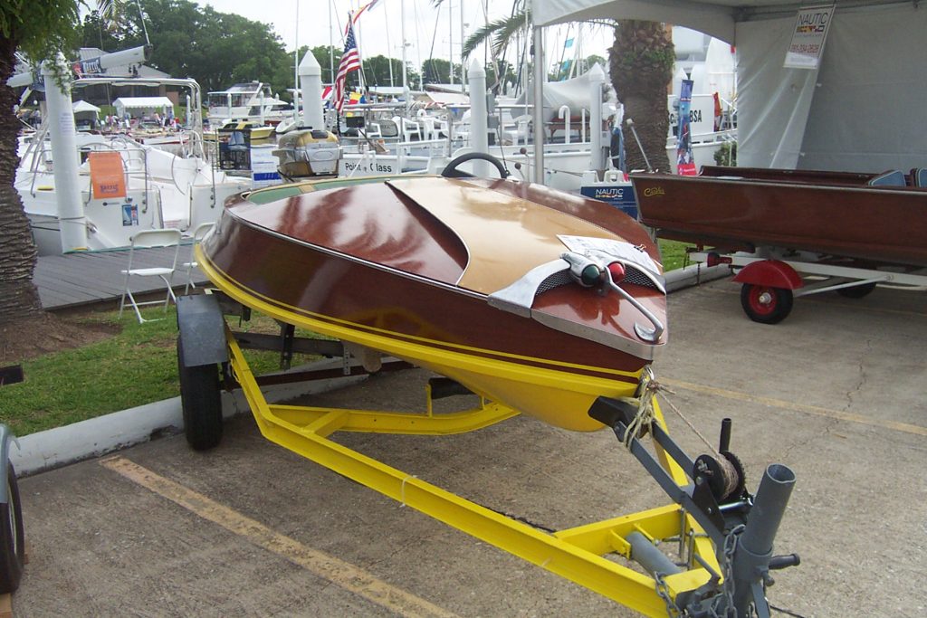 14-foot Aristorcraft Torpedo with a 1957 35-horse Johnson Javelin outboard and a McClain single-axel trailer that matches the boat.