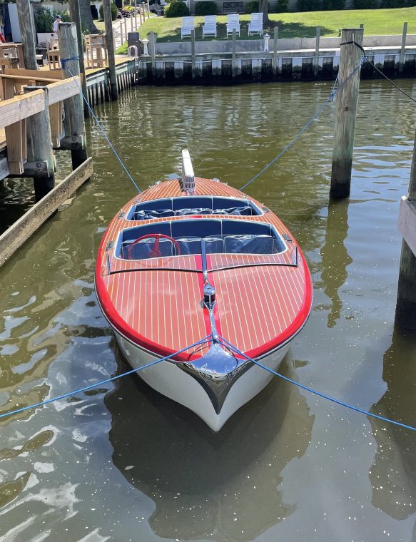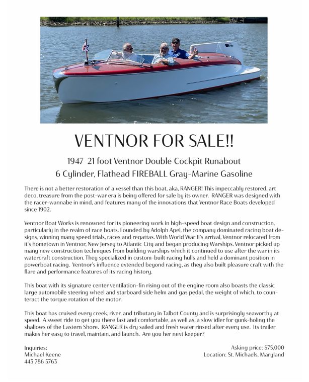 This impeccably restored, art deco, treasure from the post-war era is being offered for sale by its owner, who is moving overseas. RANGER was designed with the racer-wannabe in mind, and includes many of the innovations that Ventnor Race Boats featured, along with cruising comforts like the cushioned double cockpits, oversized steering wheel, and floor-mounted gas pedal. The Ventnor specific chromed hardware is mind blowing. This boat has cruised every tributary in Talbot County, Maryland and is seaworthy at speed, as well as, the perfect slow-idler for gunk-holing the shallows. RANGER is dry sailed and fresh water rinsed after every use. Its trailer makes her easy to travel, maintain, and launch. Are you her next keeper?