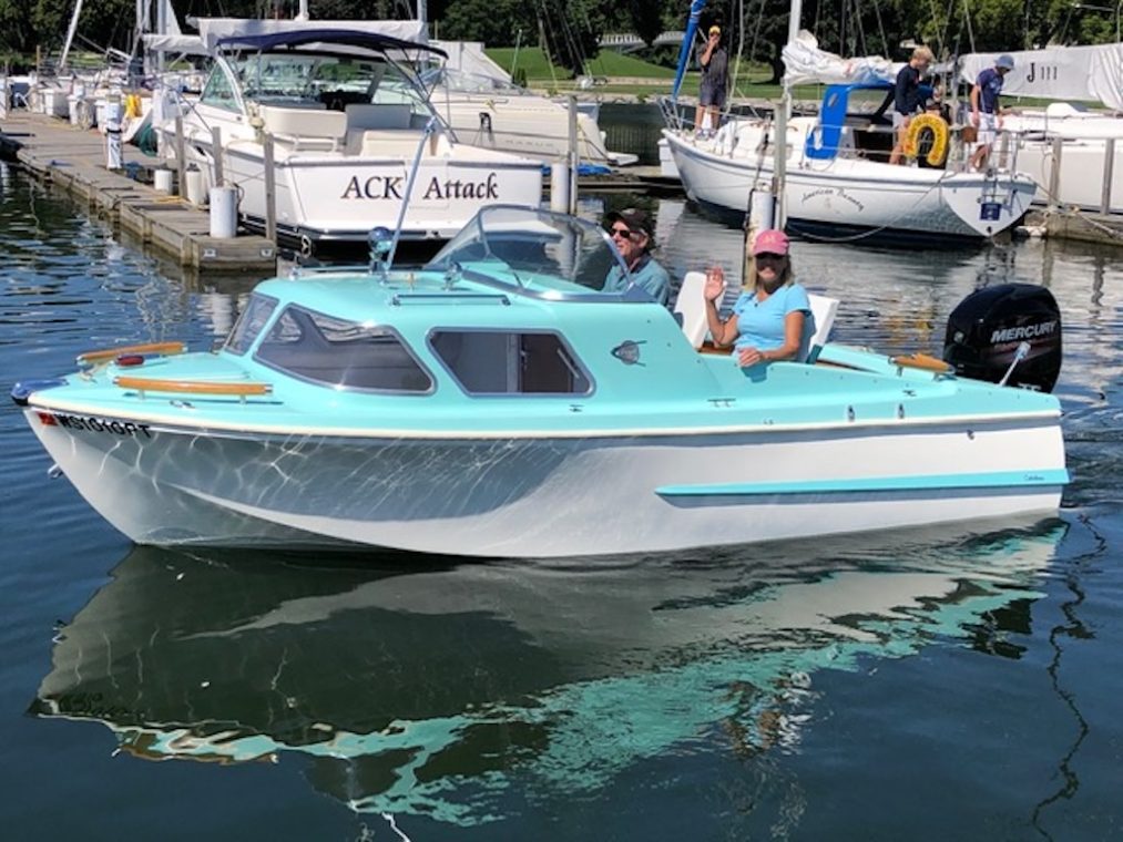 Weekender: Unique Pro redesigned/restored: 2 births with new cushions, always fresh water, upgrades, new paint, upholstery, wood, chrome, removable 2 stern seat, rewired, custom swivel height adjustable seats, newer Mercury ECO 50hp outboard handles smooth/swift. Raymond Loewy signed. Excellent trailer $25k OBO.