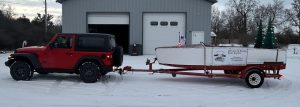 The transom was removed and will be hung in the barn next spring. The bottom was removed, it didn’t take much effort, as all wood under the water line was rotted. 2×6 stringers and 5/4×6 supports were installed to attach the plywood flat bottom. A little paint, some lights and a modified donated trailer and we were set for the parade. We heard a lot of folks along the parade route comment on “the old boat”. It was a good time!