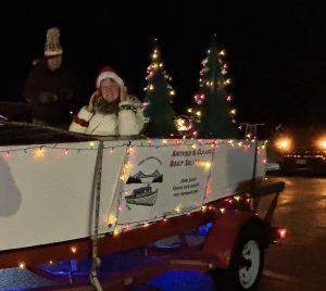 The float started as a 1947 GarWood Ensign that we were going to put a new bottom on. As the project advanced, it needed more than a bottom, she needed a total all wood replacement to make her seaworthy again. The decision was to scrap the project, sell off parts and pieces. Then the Christmas Parade thought came, “Let’s make a float representing our chapter with the hull”.